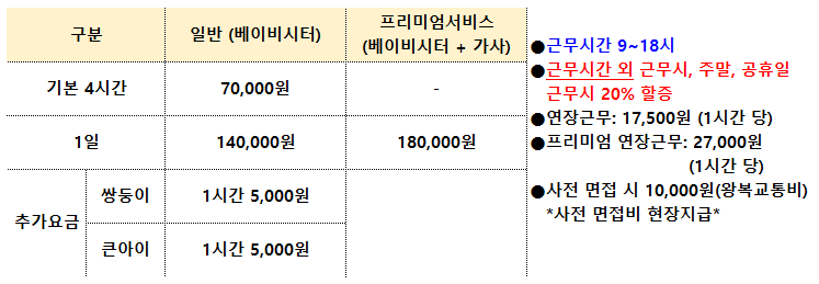 * 종일 근무시 점심 제공은 고객님 가정에서 제공합니다.